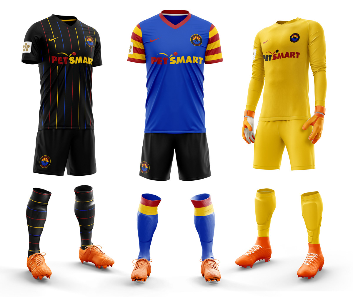 Arizona United is not how I may have done the team mark in a perfect world, I knew there would be some "WTF?" teams when it comes to identity and this is, to an extent, one of them. The crest takes its cues from the Arizona flag as well as its colors and they play at the Phoenix Grounds. The history of the team is literally a story of rebirth. Many teams in the west were small because of the sparsely populated American West had not developed. Arizona had 3 competitive teams in the early years, Tuscan, Phoenix and Mesa. The teams were struggling financially in the late 20th century with only Phoenix pulling in crowds in America Two while the other two were in the 4th tier. So, in 2005 Phoenix bought out the other two teams and they became Arizona United. The uniforms are called "Clown Suits" by the rest of the league's fans. I happen to like them a bit. The Primary kit has the sun rays on the shoulders with black shorts, while the change kits go all black with multi-colored stripes on the jersey and socks.