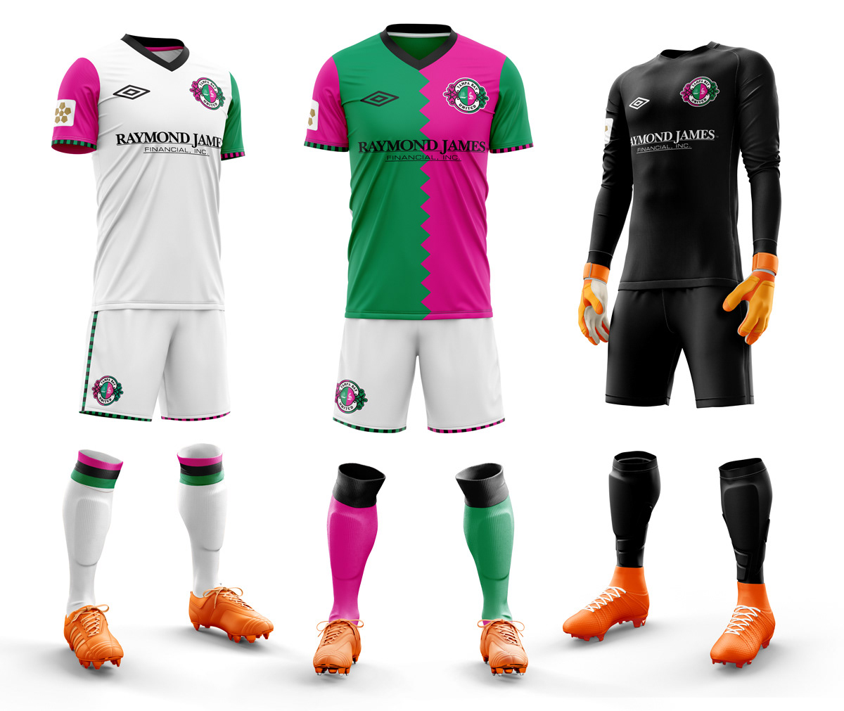 Tampa and St. Petersburg each had a team in America League with St. Petersburg SC starting play in 1940 and Tampa SC starting in 1950. The teams were able to coexist until the mid 60s when both teams started seeing attendance suffer. So, in 1976, a merger was negotiated where St. Petersburg would “buy” Tampa and they’d take over St. Petersburg spot in America One. They’ve mostly stayed in America One playing their games at Stoney Pointe. The team's logo is split 50/50 with the identities of each former team and city with icons from the flag. Overall, it’s the shape of a cigar label (hence their nickname "Cigars") with a Pelican and pink representing St. Petersburg and a ship and green representing Tampa. The team's uniform carries the half and half theme. The primary features a half and half jersey over white with a green sock and a pink sock. The change kit is a white raglan with a green sleeve and pink sleeve over white shorts and white socks.